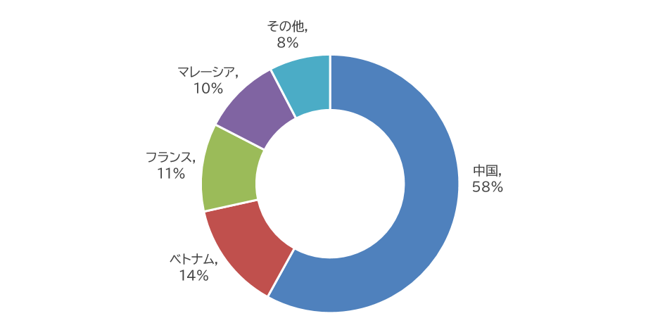 こうした私たちの生活に必要なネオジムやジスプロシウム等を含むレアアースを日本は輸入に頼っており、下記グラフに示すように特に中国への依存度が非常に高いことが分かります。